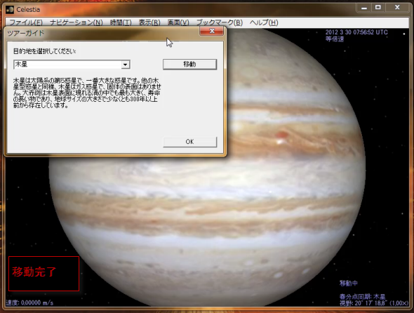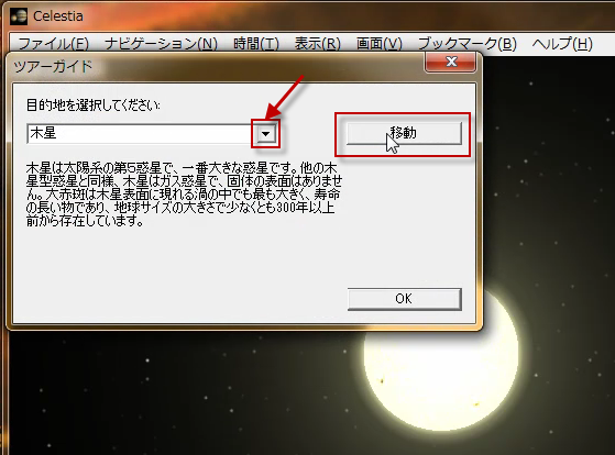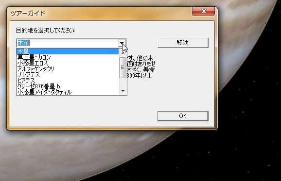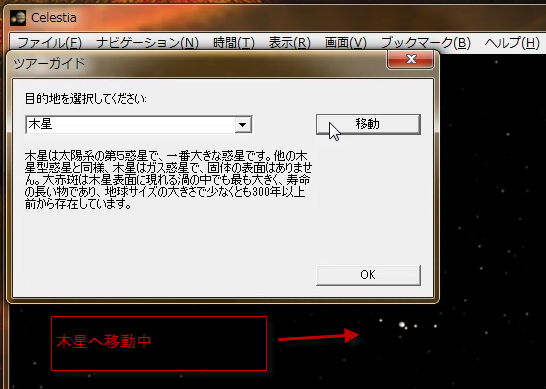 移動ボタンをクリックすると、目的地の天体に移動します。