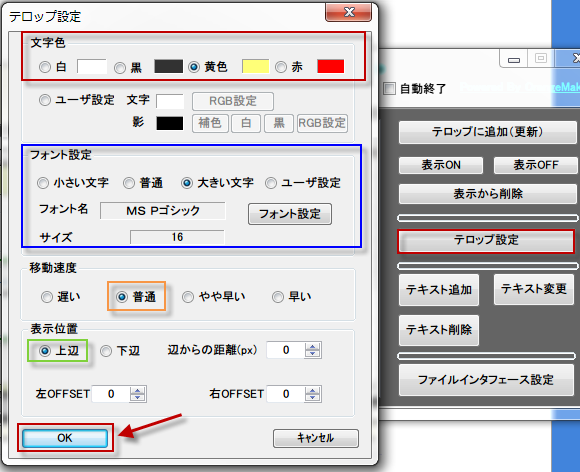 起動オプション-Tにて、設定画面を表示せずにテロップのみ設定時間表示して自動終了します。