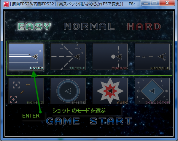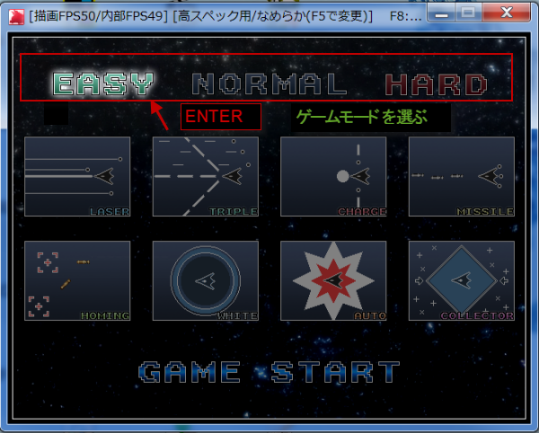 ゲームの難易度を イージー、ノーマル、ハードから選び、