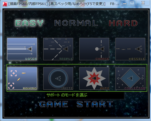 ショットの種類を選び、サポートの種類を選んでスタートします。