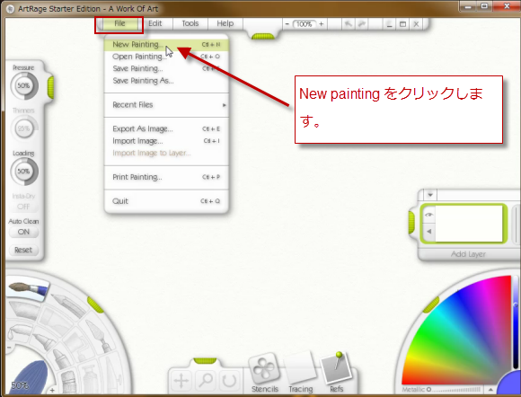 メニューからファイルを選択して、 New Paintingをクリックします。
