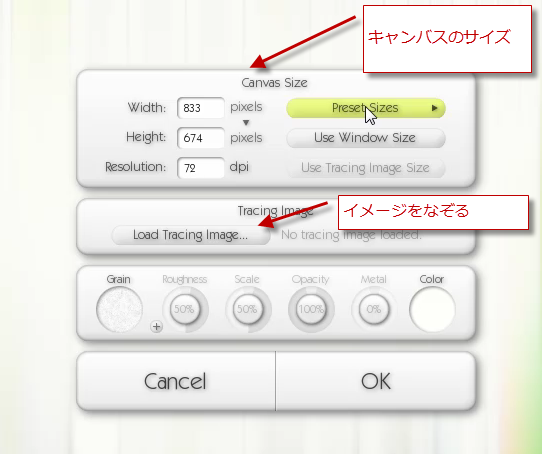 Tracing imageは、下になる画像を下絵として表示させ、その絵をなぞって描く方法です。