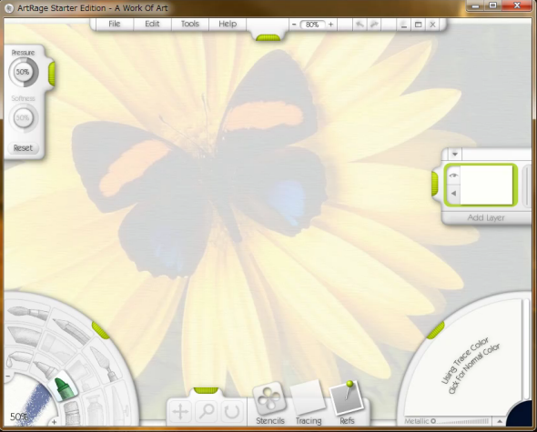 アートレイジ ArtRageスタートエディション とは、オイルブラシやパレットナイフや鉛筆、チョーク、マーカー、クレヨンなどの描画ツールを使ってお絵かきができるソフトです。
