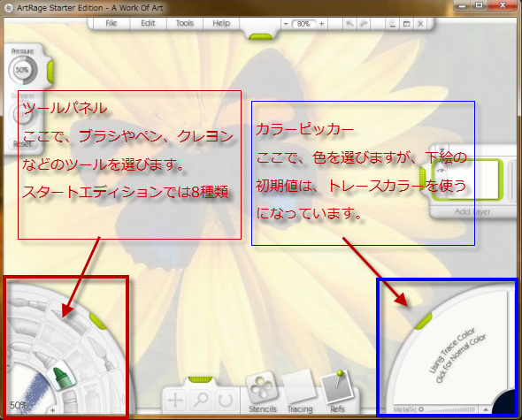 ArtRage Starter Edition で使えるツールは、8種類で左下の部分にあります。
