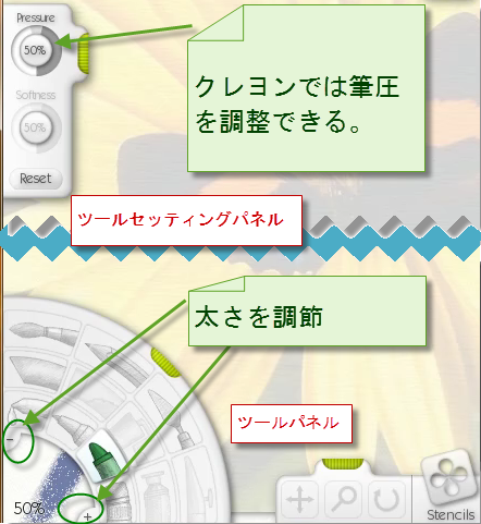 クレヨンを選択したところです。太さは、左下の-と+で調整します。