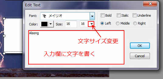 その後は、文字入力欄に文字を入力して、フォントのサイズなどを変更します。