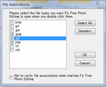 画像ファイルをダブルクリックした時に、Fly Free Photo Editing & Viewerで開きたい画像ファイルの拡張子にチェックを入れましょう。