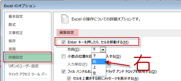 実際に入力していくために、Excelのオプションでセルの移動方向を右に変更しておきましょう。