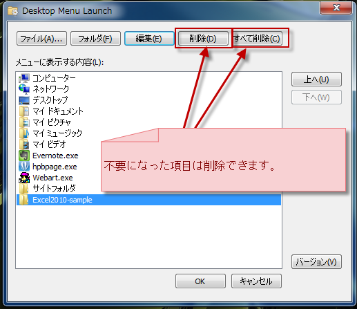 メニュー項目が不要なら、上段に表示されている「削除」や「すべて削除」ボタンを使用して削除することができます。。