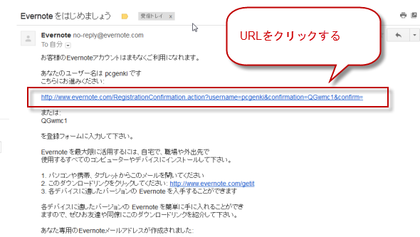次は、入力したメールアドレスにEvernoteから登録確認メールが届くので、開いたメールに記載してあるリンクをクリックすれば登録完了だ。