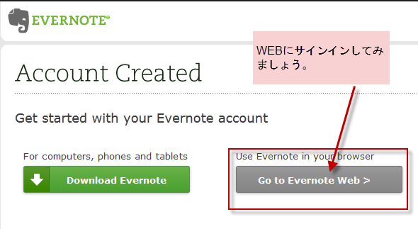 ここでは、確認メールから登録確認し、Evernote web にサインインすることにしよう。