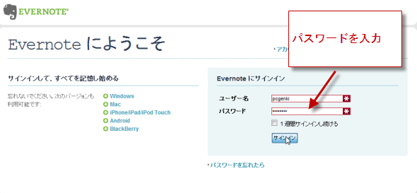 ユーザー名はすでに入力されているので、登録するときに自分で設定したパスワードを入力しよう。