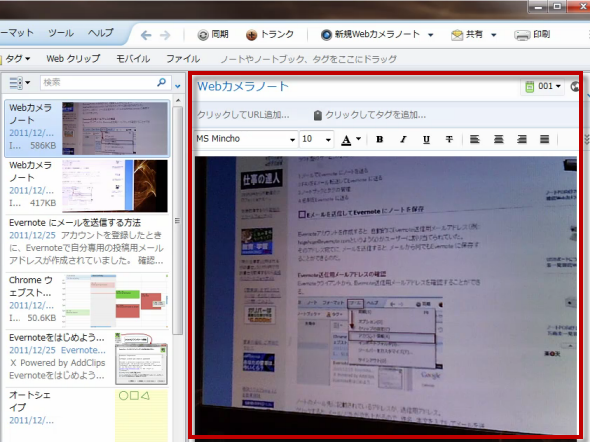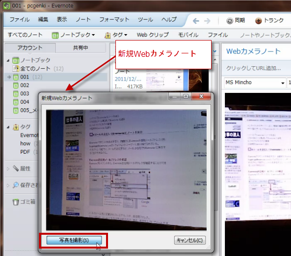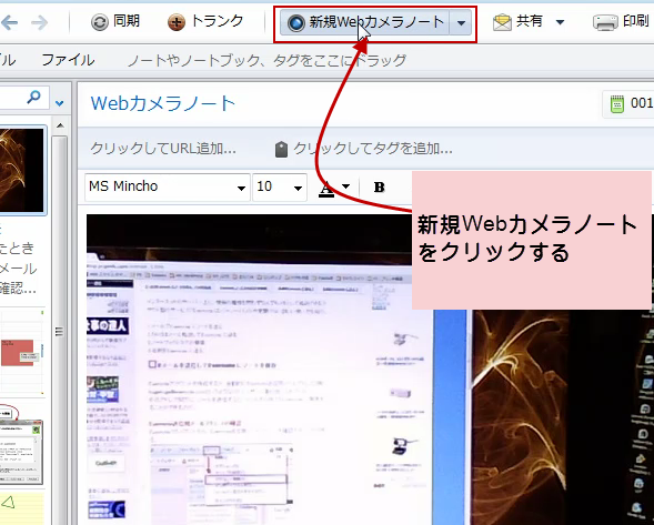 パソコンに、Webカメラが搭載してあれば、写真を撮影して、それをノートにすることができる。