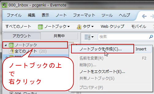 2.または、左パネルのノートブックの上で右クリック。ノートブックを作成をクリック。