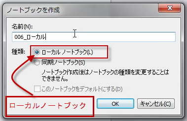 名前をつけて、必ず、ローカルノートブックにチェックを入れる。
