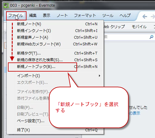 1.メニューの「ファイル」から「新規ノートブック」を選択する。