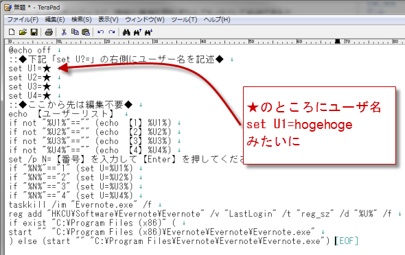 記入したら、デスクトップに「Evernote ユーザー切り替え.bat」という名前で保存する。
