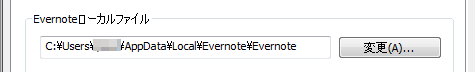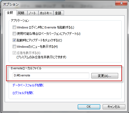 全般タブでは、Evernoteローカルファイルのフォルダの場所を変更する。