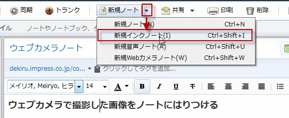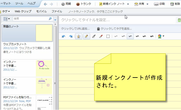 インクノートを作成するには、「新規インクノート」をクリックする。