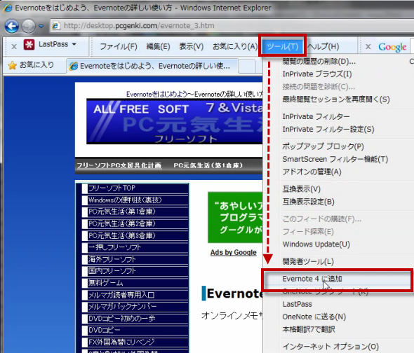 ツールから、「Evernote 4に追加」をクリックすると、ノートに追加できる。