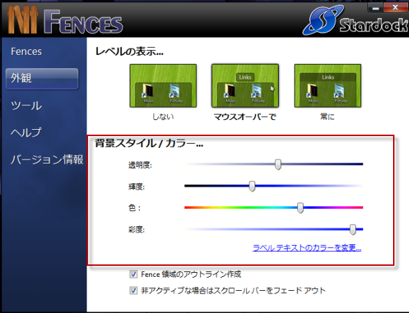 外観のスタイル/カラーで、スライダーを適当に移動して、