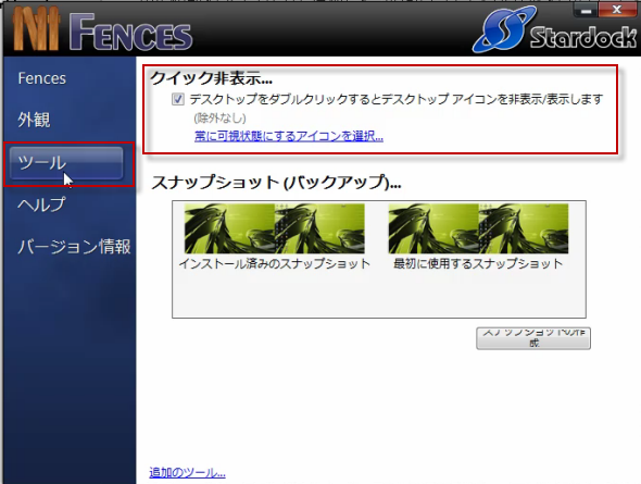 ツールにあるクイック非表示をONにしておくと、デスクトップ上のすべてのフェンスとアイコンを、ダブルクリックで一度に隠したり表示させることができます。