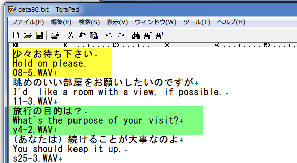 3行1組で、日本文、英文、音声(wav)となっています。