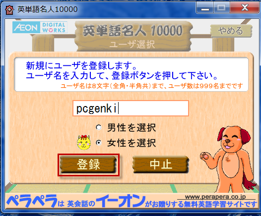 ユーザー名を登録して、性別を選択します。登録ボタンをクリック。