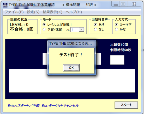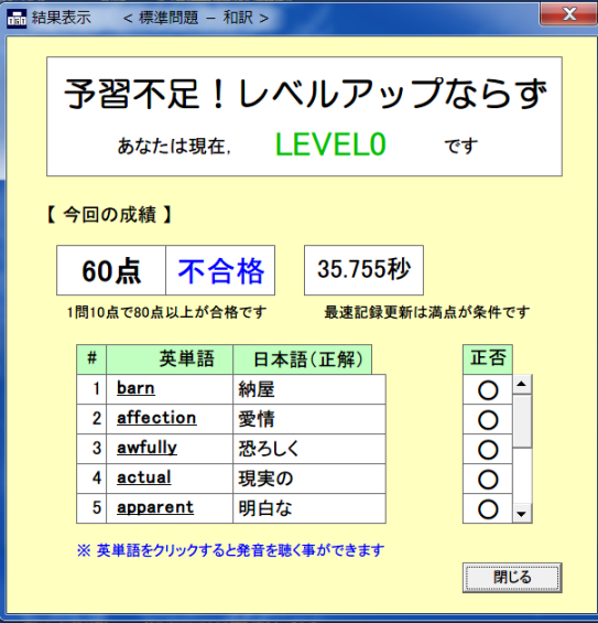 音声ファイルをインストールすると、出題時・テスト結果確認時に英単語の発音を聞くことができますよ。