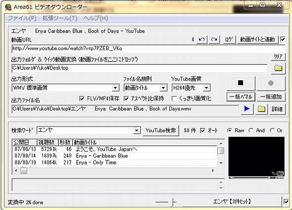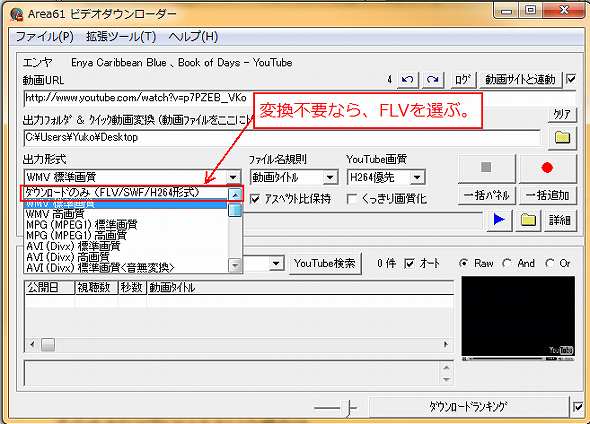 YouTubeからダウンロードする動画は一旦FLV動画として保存され、指定された出力形式に変換(エンコード)されます。
