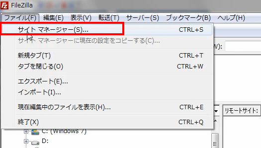 FileZillaへ接続するサイトの情報などを登録するには、 メニューバー 『ファイル(F)』から『サイトマネージャ...(S)』を開きます。