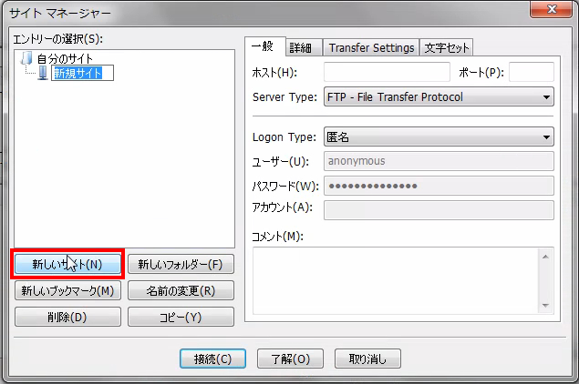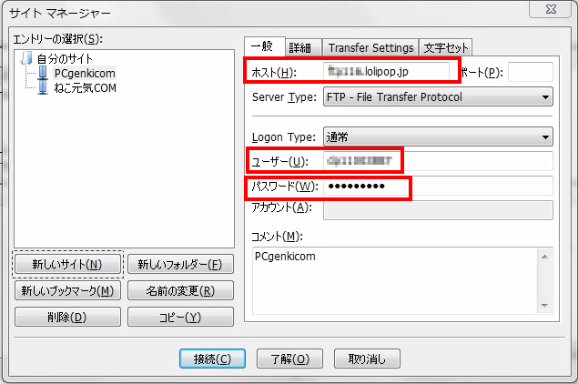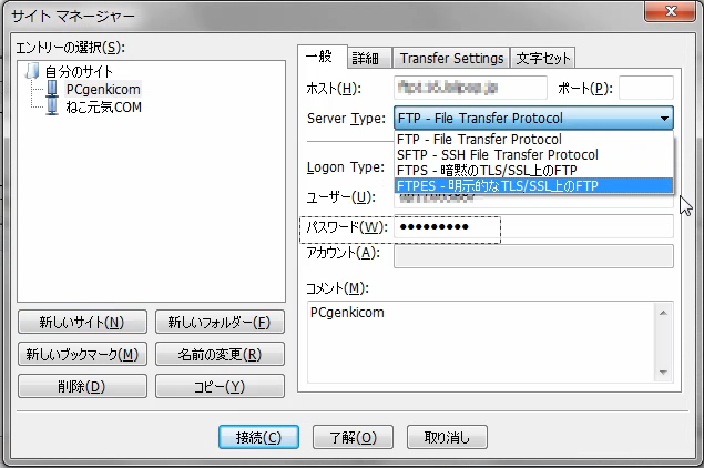 サーバの種類:FTPES(レンタルサーバーに確認のこと)