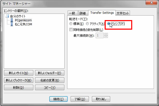 転送設定で、パッシブを選択。