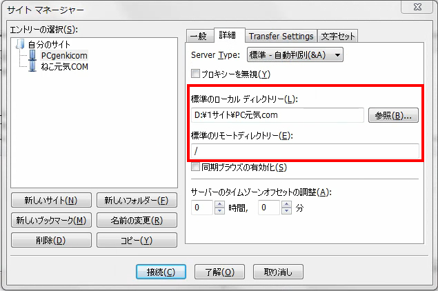 「標準のリモートディレクトリ」は、webコンテンツのディレクトリの設定で、