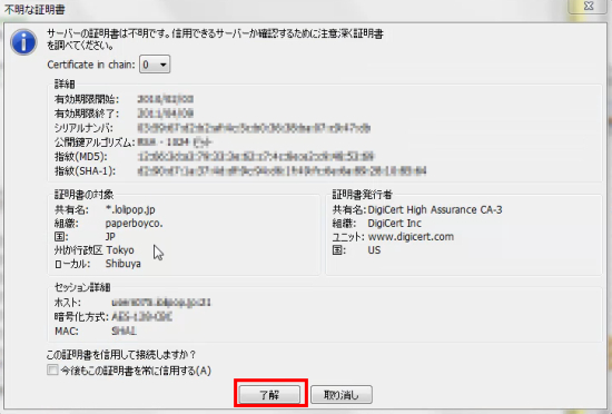 『今後もこの証明書を常に信用する(A)』にチェックを入れて、『了解』をクリックします。