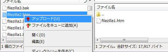 今度は、右クリックメニューからアップロードを選択してアップロードする場合です。