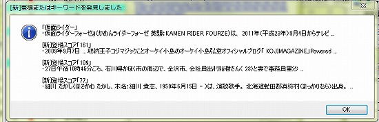 もし、通知登録したワードや新登場のワードがあると、上図のようにダイアログがポップアップして知らせてくれます。