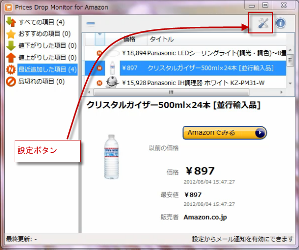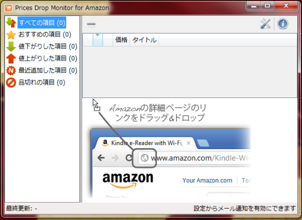 Prices Drop Monitor for Amazon本体の起動画面です。