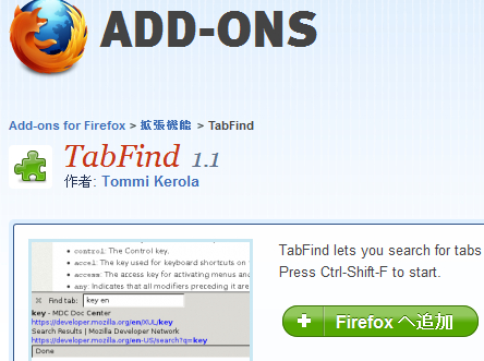 このアドオンは、「TabFind」といいます。