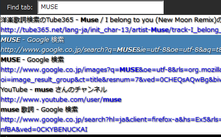 「TabFind」は、開いている多くのタブのタイトルとURLに含まれているキーワードでタブを検索するアドオンです。