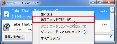 ダウンロードしたファイルの保存フォルダを開く時は、右クリックメニューから保存フォルダを開くを選択します。