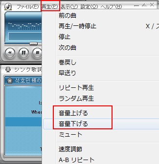 [メニューバー] の [再生] - [音量上げる/ 音量下げる/ ミュート] から選択
