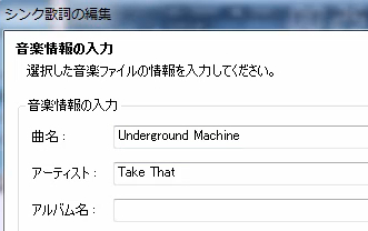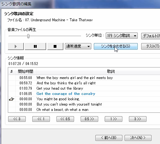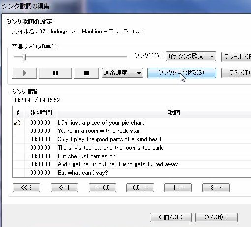 音楽を再生させながら、歌詞の頭の直前で「シンクをあわせる」ボタンをクリックします。