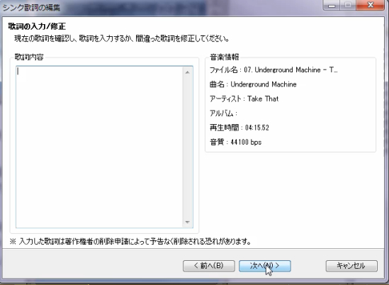 歌詞を入力したので、次へをクリック