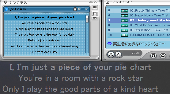 下の歌詞は、デスクトップ歌詞を表示しているところです。