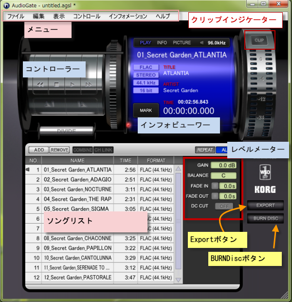 AudioGateでは、ソング・リスト上のオーディオ・データを内容にかかわらず、すべて「ソング」と呼びます。