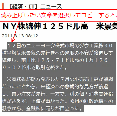 クリップボード監視に設定してあると、Webページなどをコピーした時点で、貼り付ける前に、文章を読み上げます。