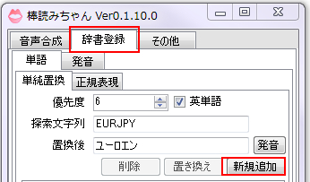 読み上げを登録したい単語を辞書登録タブをクリックして登録します。