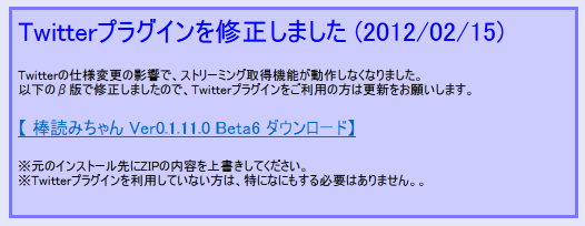 棒読みちゃんでTwitterを読み上げさせたい人は、Twitterの仕様変更のため、プラグインの修正が必要です。