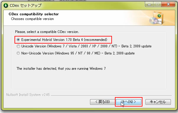 インストールするバージョンを選びます。一番上のデフォルトのバージョンを選択して、次へをクリック。